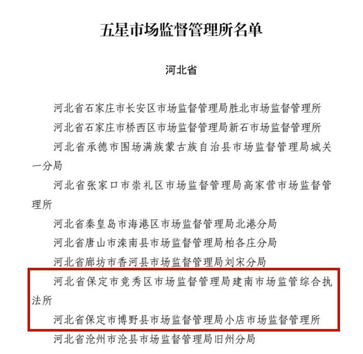 经过综合评定,全国共有312个市场监督管理所被评定为五星市场监督管理所。河北省共有14个市场监督管理所被评为五星市场监督管理所,其中,保定市竞秀区市场监督管理局建南市场监管综合执法所和保定市博野县市场监督管理局小店市场监督管理所被评定为五星市场监督管理所。