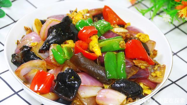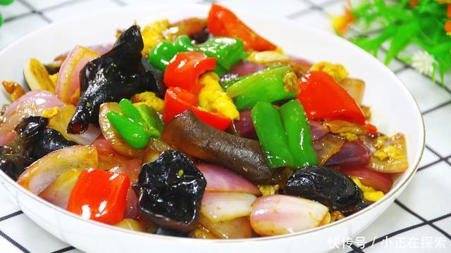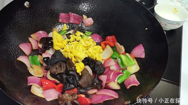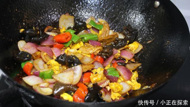 7、下入洋葱翻炒,洋葱稍微变软后倒入青红椒炒至断生,倒入鸡蛋、木耳、肉片后调味、盐、鸡精、生抽、蚝油、少许淀粉水,大火翻炒均匀就可以出锅了;