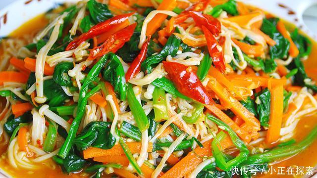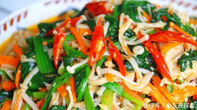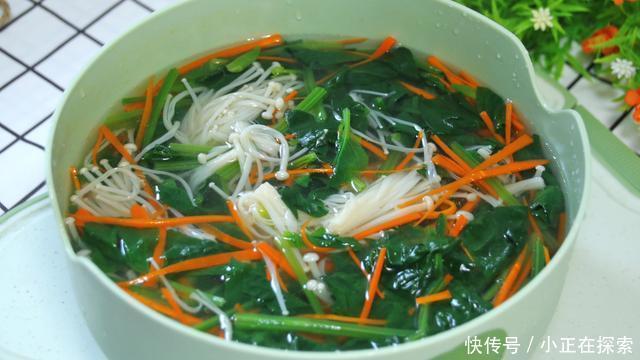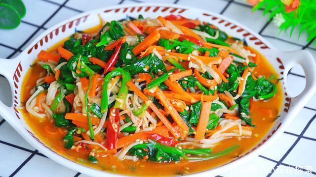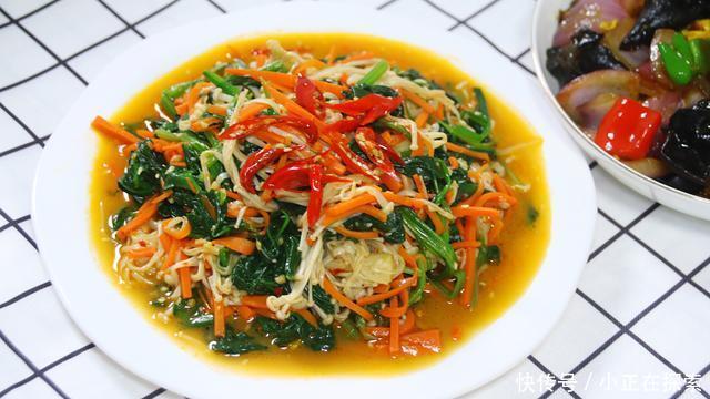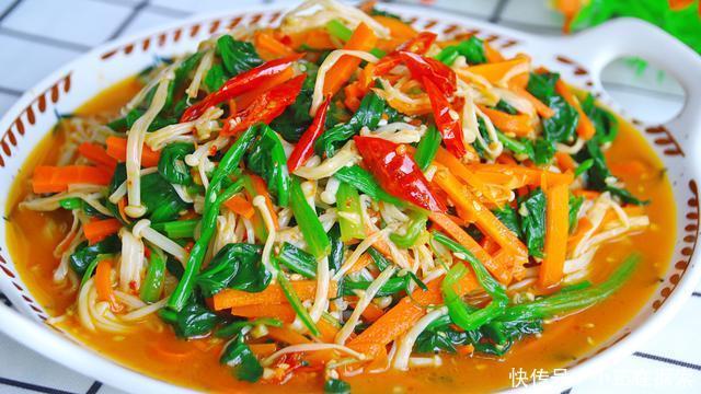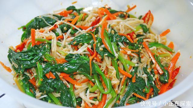 这样做的菠菜拌金针菇,下酒又下饭,吃起来酸辣可口,清爽解腻,关键还不怕胖,天热没胃口可以安排起来哦;