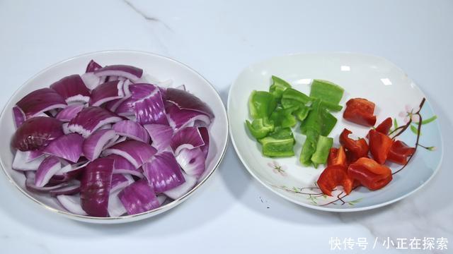 1、午餐还安排一个洋葱炒蛋,洋葱切成块状、青红椒各一个也切成块;