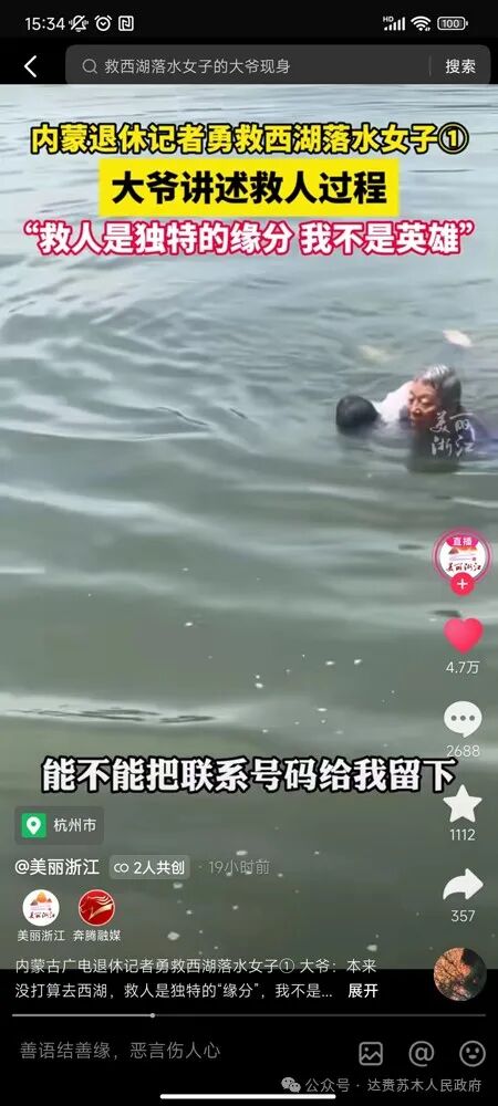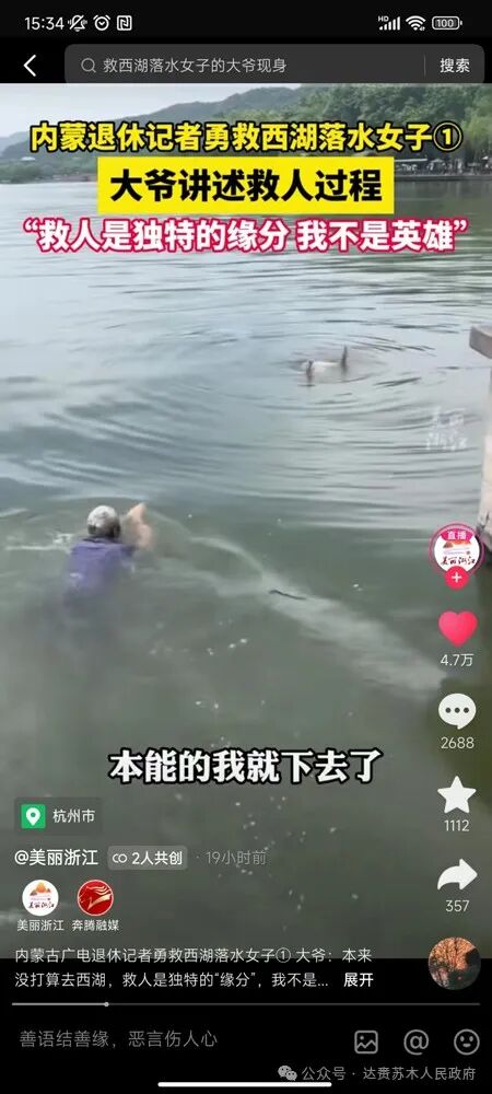 这两天,一段“白发大爷跳入西湖救人”的视频火了。大爷救完人,在西湖边拧干衣服的一幕也被全网点赞。网友留言:“救人还得是大爷,为大爷点赞。”