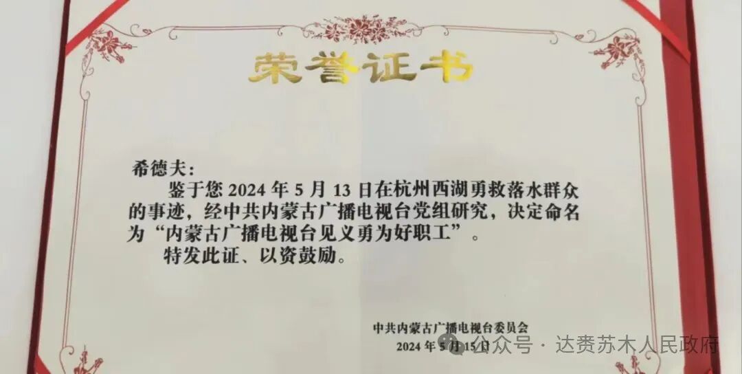 为弘扬见义勇为精神,倡导见义勇为行为,内蒙古广播电视台授予希德夫“内蒙古广播电视台见义勇为好职工”称号。