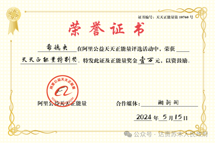 阿里公益天天正能量也联合潮新闻钱江晚报为希德夫颁发正能量特别奖及奖金10000元。