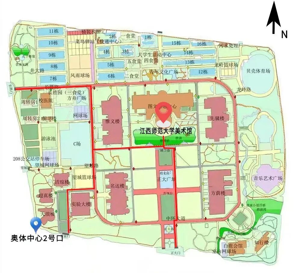 停车:可导航至江西师范大学瑶湖校区长胜门或正大门进入,停至美术馆附近停车位即可