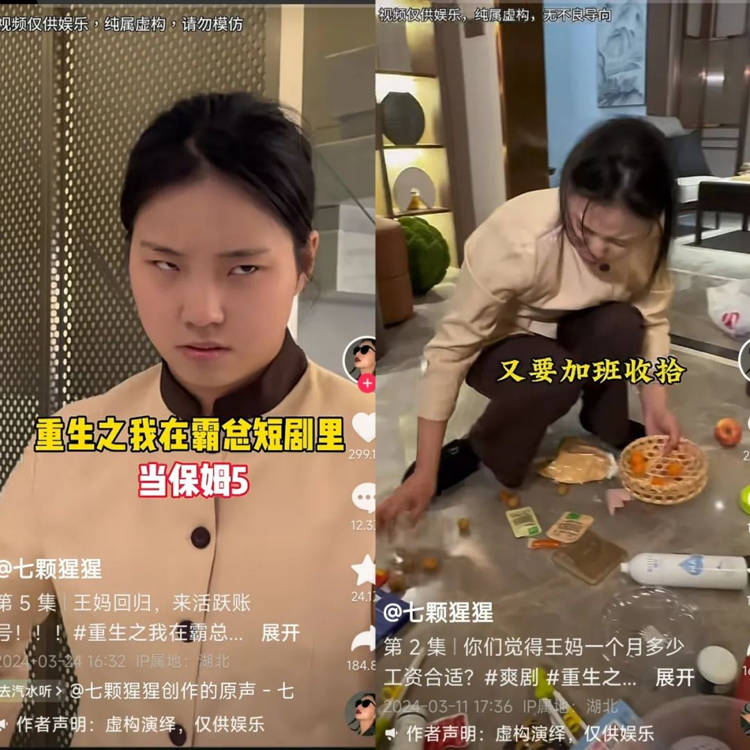 从2024年3月开始,“七颗猩猩”连续推出重生系列《重生之我在霸总短剧里当保姆》《重生之我在短剧里当主角》等,围绕反套路人设,借“王妈”之口对剧情、角色犀利吐槽,内容广受欢迎。