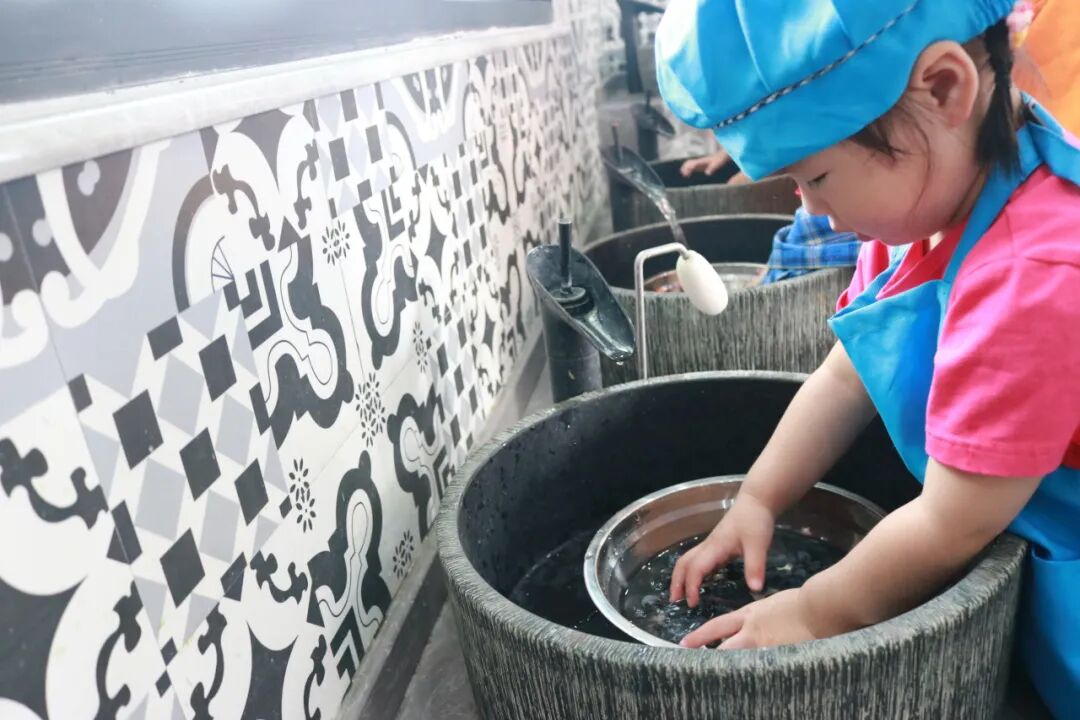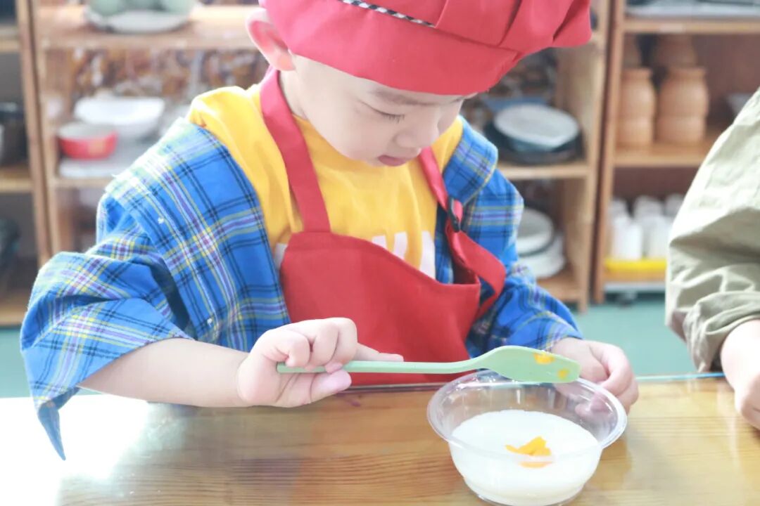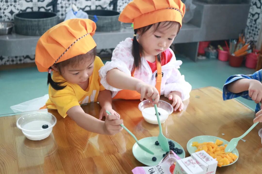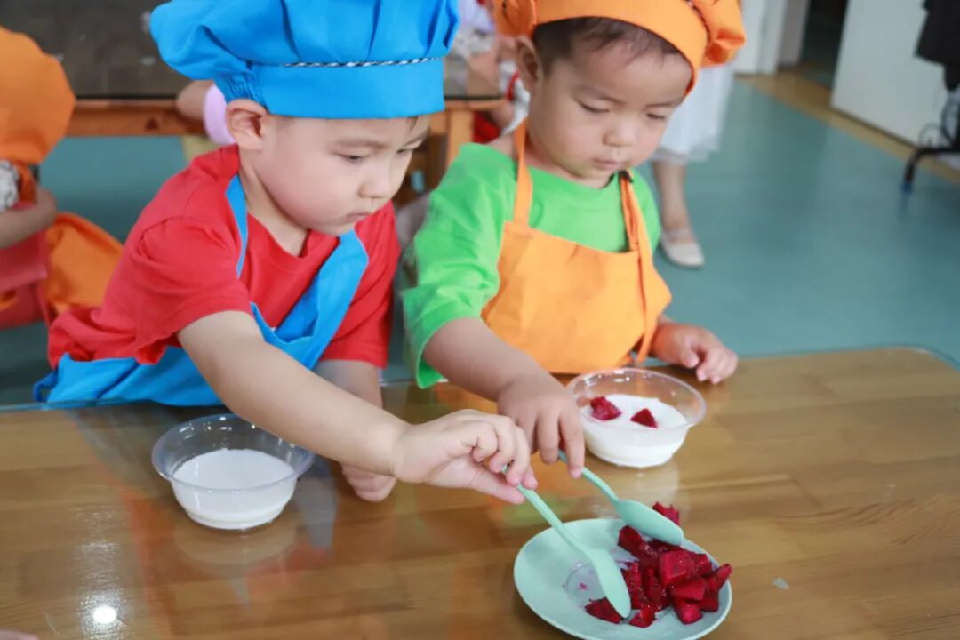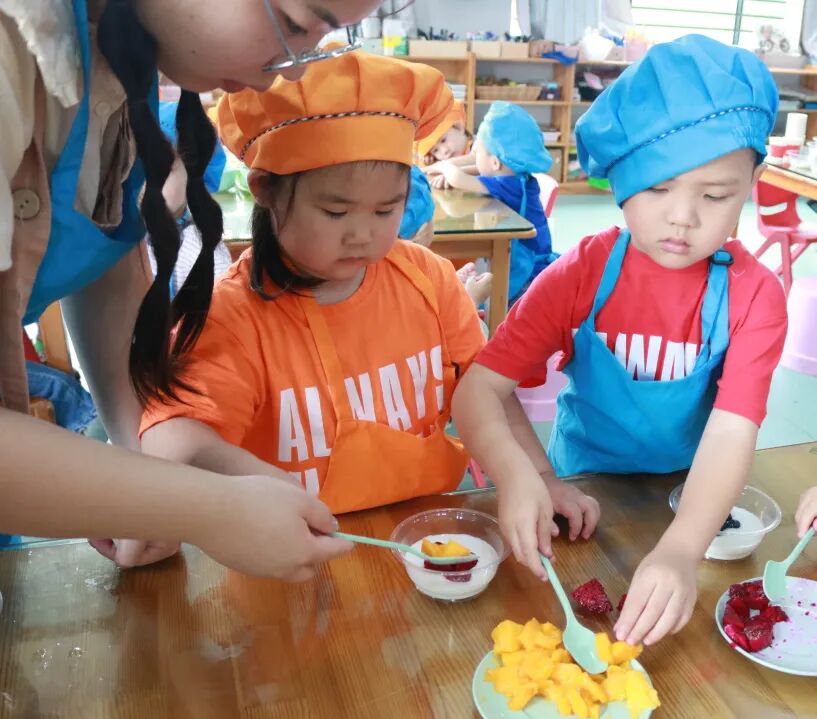 双皮奶凝固后,在老师的带领下,孩子们纷纷变身小厨师,迫不及待地要开始创作属于自己的水果双皮奶了。