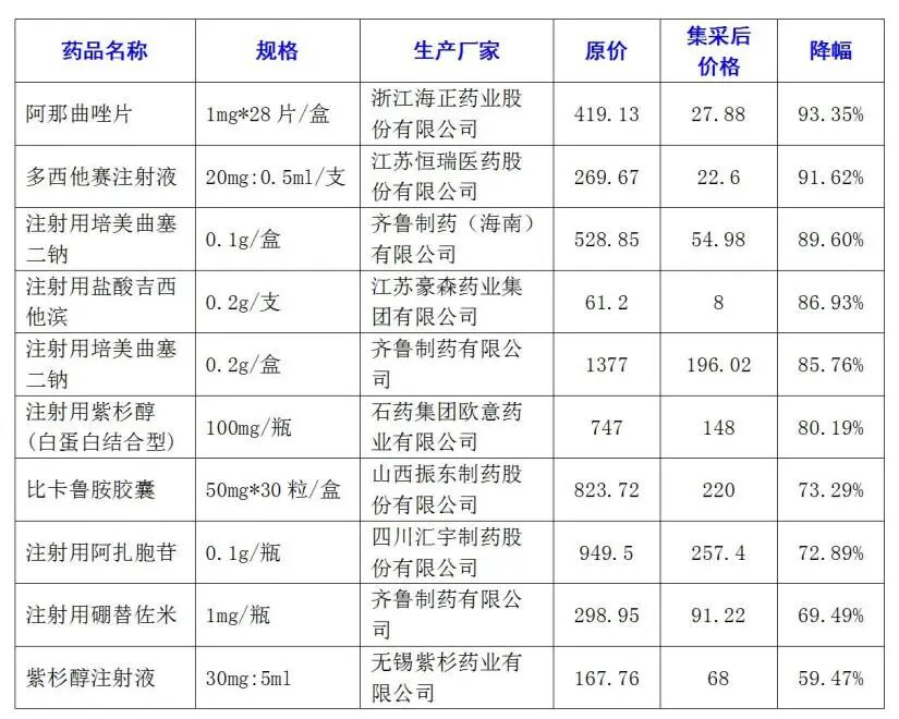 目前大多数慢病治疗药物已基本进入集采药品目录,其中抗肿瘤药物进入集采后药品价格下降尤为明显,如注射用培美曲塞二钠(0.2g/盒)由原来的1377.00元/盒降至196.02元/盒,让肿瘤患者切实享受到了集采政策的红利。