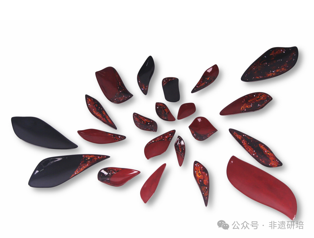 这是一位在日留学的同学余丹璐本科毕业时的作品,名叫“象山校园里的叶子”。差不多是深秋时节,她去观察校园不同的落叶造型,以此为基础展开创作。胎体是木胎,技法很简单,就是素髹和变涂,整组作品是在叶子主题及色彩等视觉相对统一的情况下,在造型、表面细节上进行了变化,不仅做到了系列创作“统一与变化”的基本要求,同时又较为贴合聚集的落叶在我们心中的印象。那这组叶子是做什么用的呢?仔细观察会发现,叶子下面并非平整,而是有点凹进去的,同现实的落叶一般有个微微卷曲的弧度,作者巧妙地利用了这样的弧度将其作为茶点托盘。以叶子盛载食物,以自然材料制作叶子,整组作品的自然气息非常浓郁。当时我对于毕业生的要求就是根据自身的感受去设计作品,彼时正值落叶之季,每天走在校园内都会不断被落叶提示着天候季节,她就通过观察有了这样的主题,并不复杂,亲切又兼顾实用,很精巧。