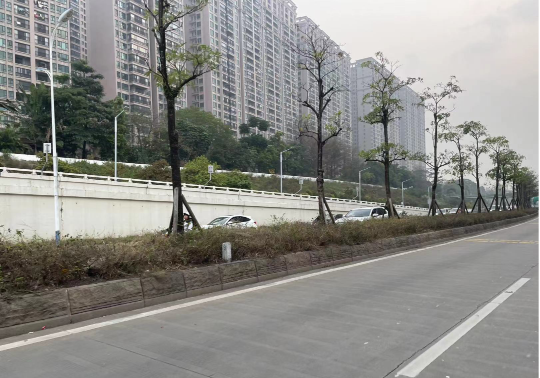 护堤路作为连接湘桥区、潮安区的交通大动脉之一,车流量大,道路中间的绿化受尾气、扬尘影响较大,原有种植的灌木品种杂乱,整体景观效果较差。