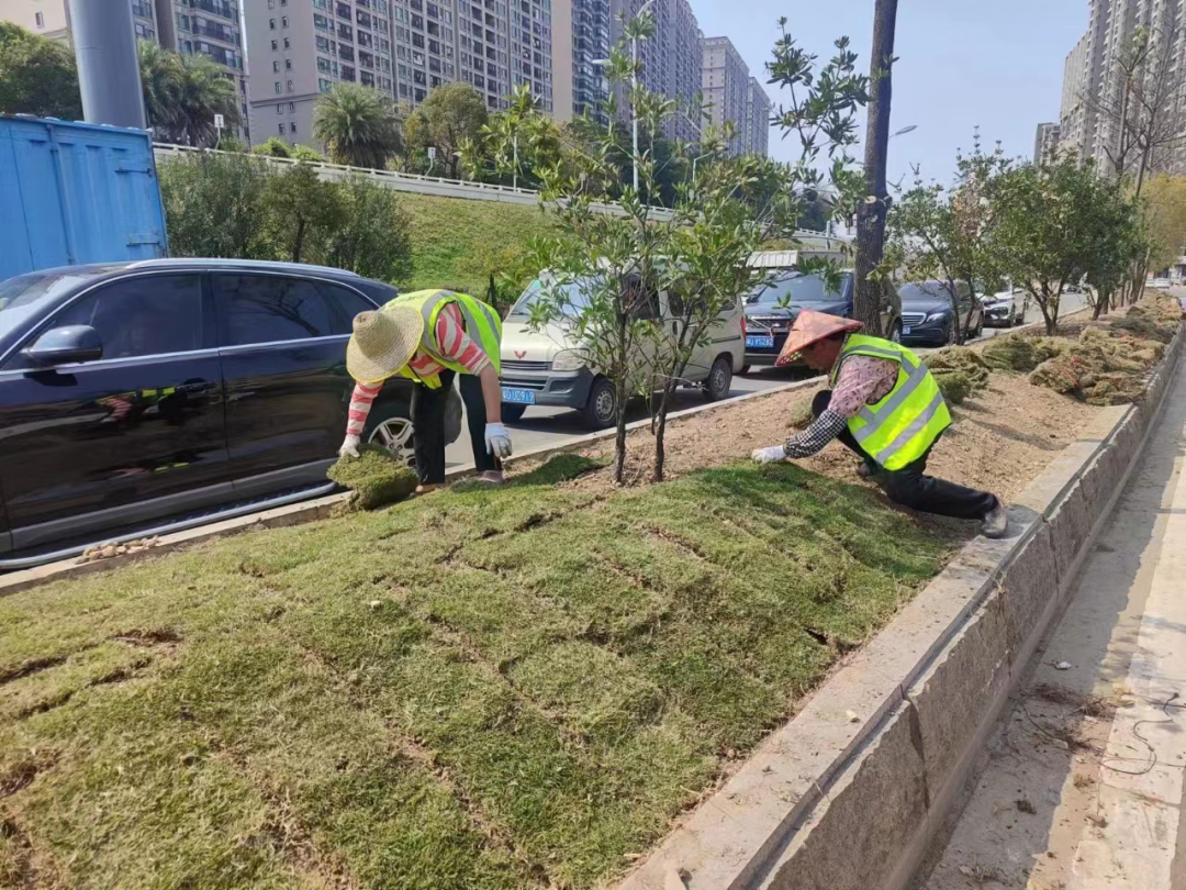园林绿化工作人员清理杂草杂物,铺植台湾草卷