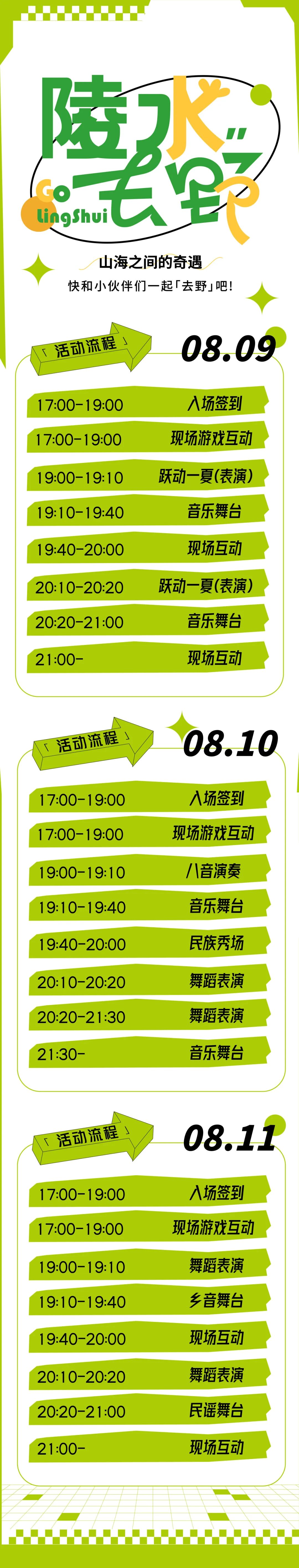 「2024去野陵水」安排了丰富多彩的活动内容,包括音乐演出、街舞表演、竹竿舞互动、露天电影、趣味游戏、创意市集、星空露营等等。每日17:00至21:00,当夕阳的余晖洒满大地,一场关于山海之间的奇妙旅程悄然开启。