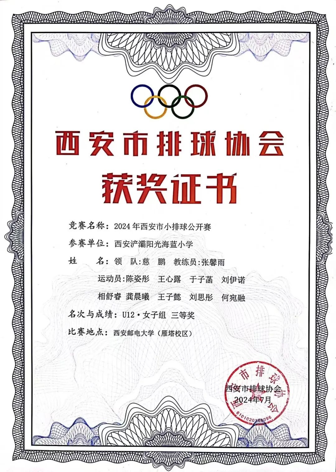 7月9日,在西安邮电大学(雁塔校区)体育馆举办的2024年西安市小排球公开赛,我校20名排球小将,获得U10混合组二等奖、U12女子组三等奖,同时在小排球综合素质测试比赛中获得U12女子组第七名的好成绩!