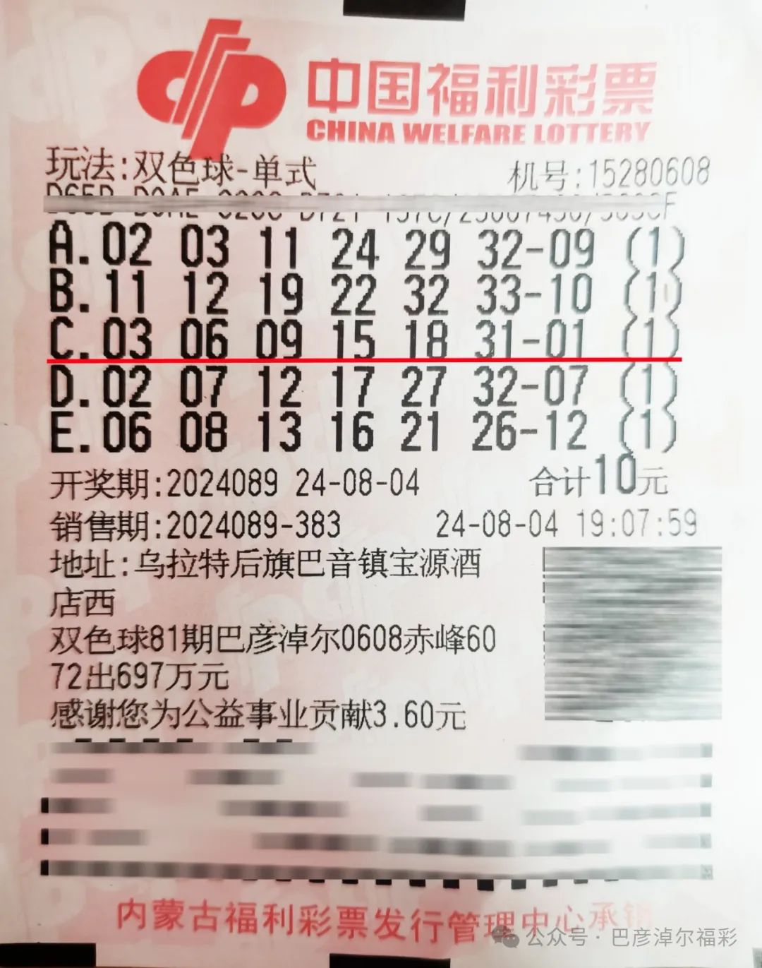 nceid="9387925794655652564" data-type="video" data-mediatype="undefined" data-authiconurl="https://dldir1v6.qq.com/weixin/checkresupdate/icons_filled_channels_authentication_enterprise_a2658032368245639e666fb11533a600.png" data-from="new" data-width="1080" data-height="1920" data-id="export/UzFfAgtgekIEAQAAAAAAXjsYxMJvQQAAAAstQy6ubaLX4KHWvLEZgBPE8qcEDkkXYa2LzNPgMIvmH8Kwdr0zxDFsR8Jiofxc" data-isdisabled="0" data-errortips="">在这个充满惊喜与收获的季节,巴彦淖尔市传来了令人振奋的消息!8月4日晚,中国福利彩票双色球游戏进行第2024089期开奖,摇出的红球号码为9、6、15、18、31、3,蓝球号码为1。巴彦淖尔市乌拉特后旗15280608号福彩销售站时隔不到20天,再次中出双色球一等奖。据悉,中奖彩民凭借一张10元机选单式票,成功揽获1注一等奖,奖金6626327元,这无疑是福运的延续,更是公益力量的璀璨绽放!双色球不仅仅是一个带来幸运的游戏,更是传递爱心、助力公益的桥梁。每一张彩票的购买,都有一部分资金投入到公益事业中,为无数需要帮助的人们送去温暖和希望。在巴彦淖尔,福彩事业的蓬勃发展让更多人感受到了公益的力量。此次同一销售站的连续中奖,不仅是幸运的象征,更是对广大彩民积极参与公益事业的有力回馈。让我们为这份幸运欢呼,同时也感谢每一位支持福彩事业的朋友,因为有您的参与,中国福利彩票才能够汇聚更多的爱心,为社会创造更多的美好!