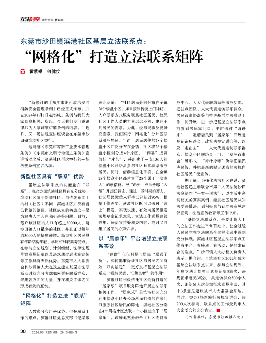 6月20日,2024年第6期《人民之声》杂志刊发了《东莞市沙田镇滨港社区基层立法联系点:“网格化”打造立法联系矩阵》。全文如下。