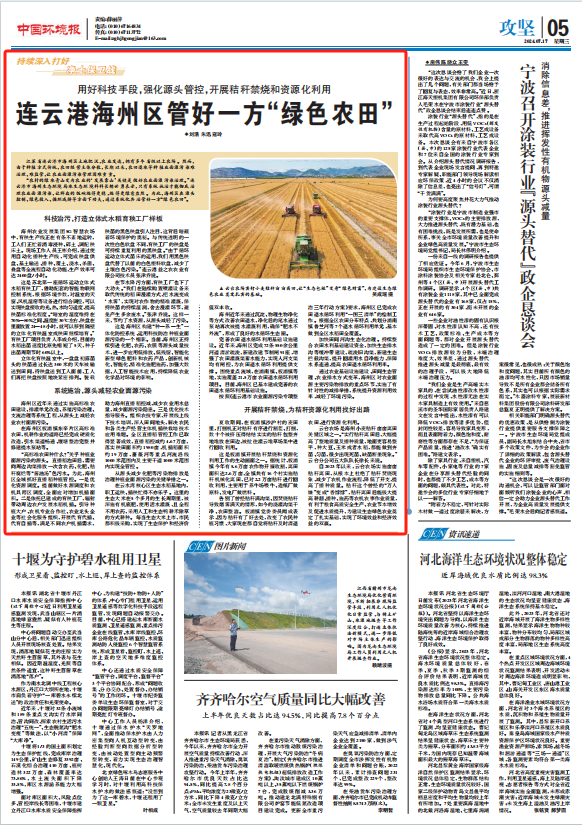 ?2024年7月17日《中国环境报》攻坚版头条深入报道海州区用好科技手段,强化源头管控,开展秸秆禁烧和资源化利用, 管好一方“绿色农田”。