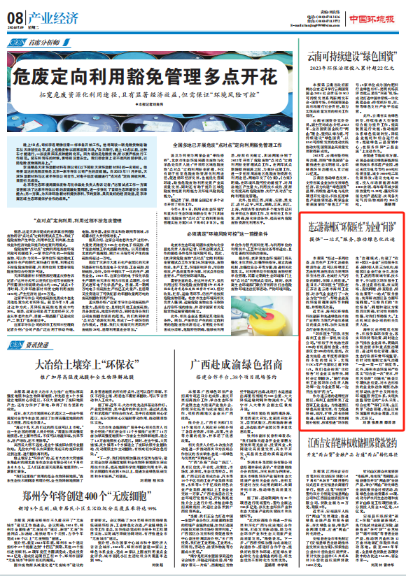 ?2024年7月9日《中国环境报》报道海州区“环保医生”为企业“问诊”, 提供“一站式”服务,推动绿色化改造。