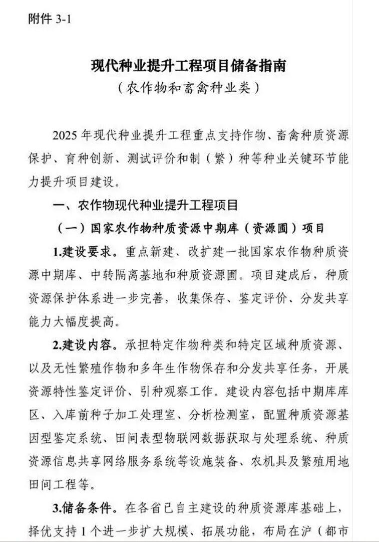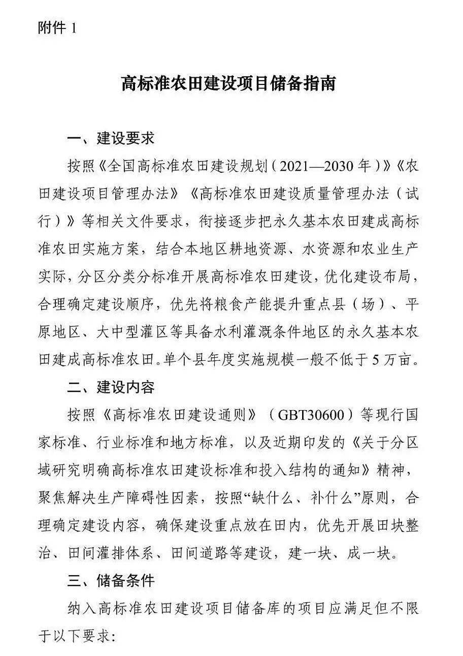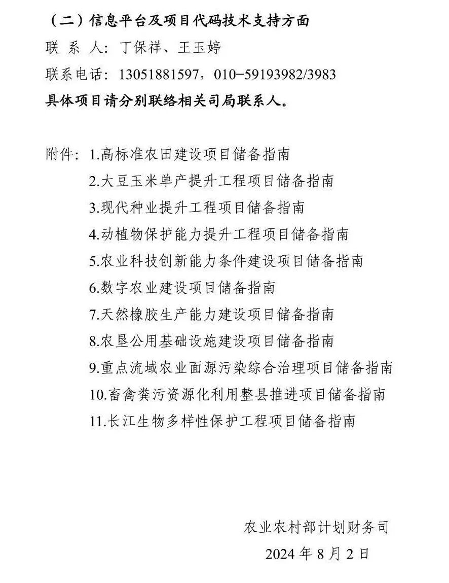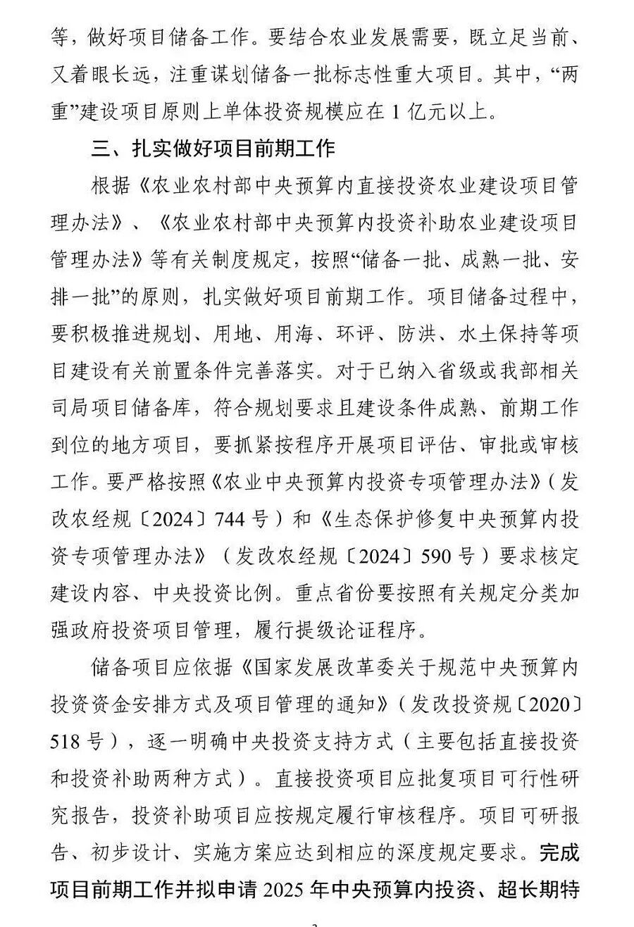 2.要着眼2025年和“十五五”时期,对标“两重”建设目标任务,结合本地区农业农村基础设施短板弱项和实际需要,围绕高标准农田建设、单产提升等农业生产发展,现代种业、动植物保护、农业行业基础能力建设,畜禽粪污、面源污染治理、长江生物多样性保护等农业绿色发展,做好项目储备工作。(具体见附件指南)