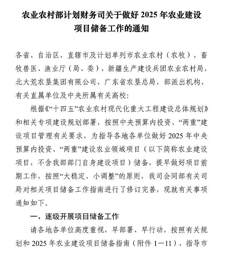 为指导各地各单位做好2025 年中央预算内投资、“两重”建设农业领域项目储备,提早做好项目前期工作,农业农村部计划财务司近期印发了《关于做好2025年农业建设项目储备工作的通知》(农计财便函〔2024〕2258号)。通知要点总结: