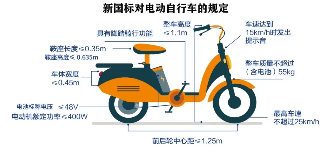 电动自行车整车高度、宽度、前后轮中心距都有明确的数值范围(如下图)。购买前,要认真核对实际数值是否符合规定。