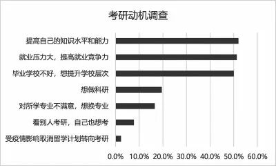 通过对考研动机的调查分析,超过半数考生读研目的是为了提升自身的知识水平和能力,以及由于就业压力大,提高就业竞争力;认为毕业学校不好,想提升学校层次为另外一个重要因素。此外,受疫情因素影响导致出国留学受阻转向国内考研成为新的考研动因。