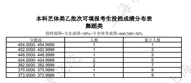 <2024年上海市普通高校招生本科艺体类乙批次可填报考生成绩分布表>↓↓↓