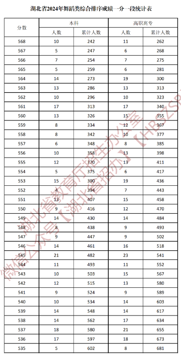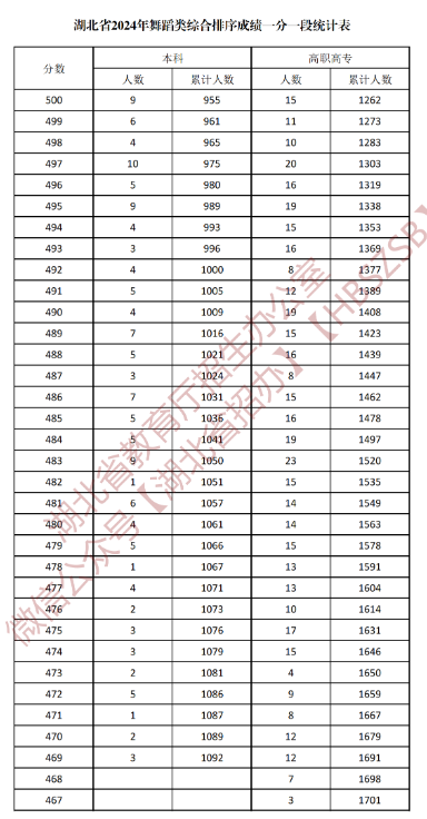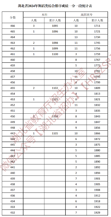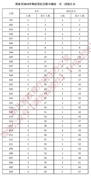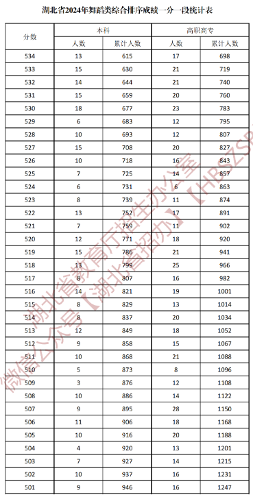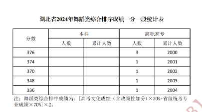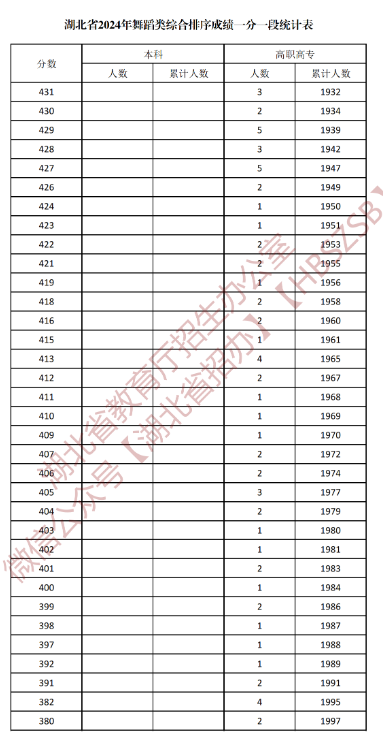 <湖北省2024年舞蹈类综合排序成绩一分一段统计表>↓↓↓