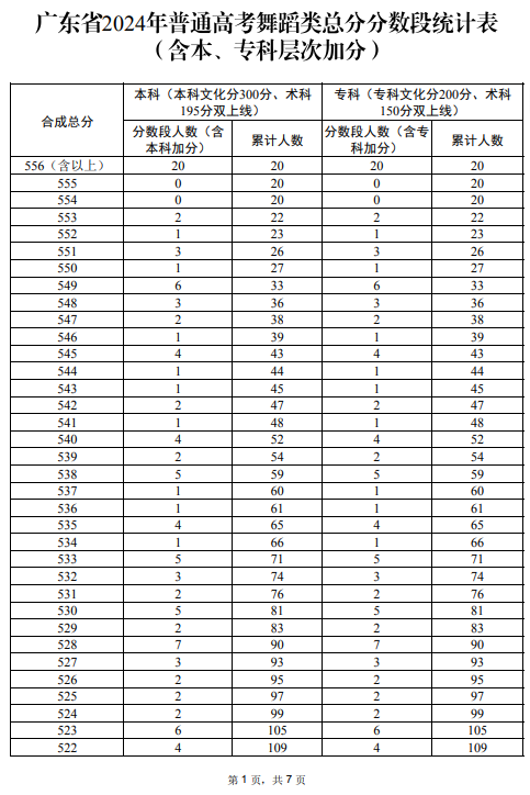 <广东省2024年普通高考舞蹈类总分分数段统计表>↓↓↓