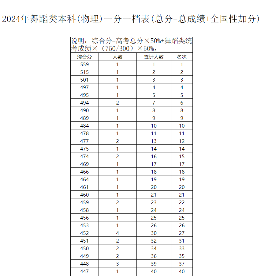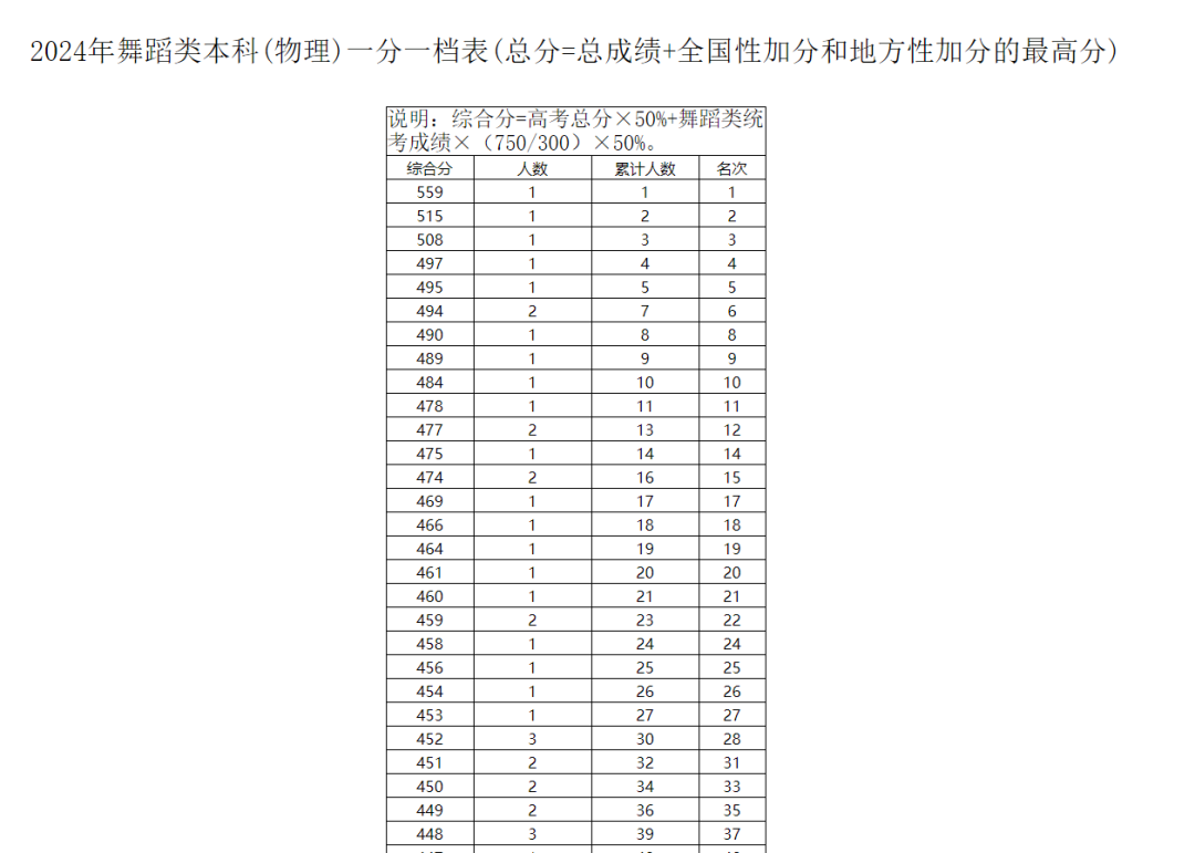 - 2024年舞蹈类本科(物理)一分一档表(总分=总成绩+全国性加分)-