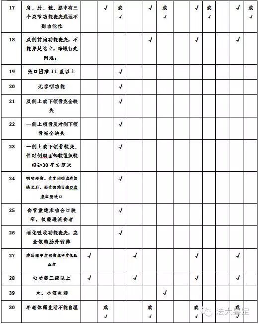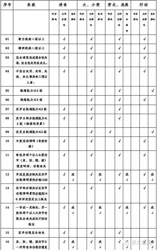 4.30上述条款未涉及的残疾,影响进食、大小便、穿衣洗漱、行动(翻身、自主行动)四项内容,其中一项完全不能自主完成或者三项以上大部分不能自主完成的可以认定为生活不能自理。