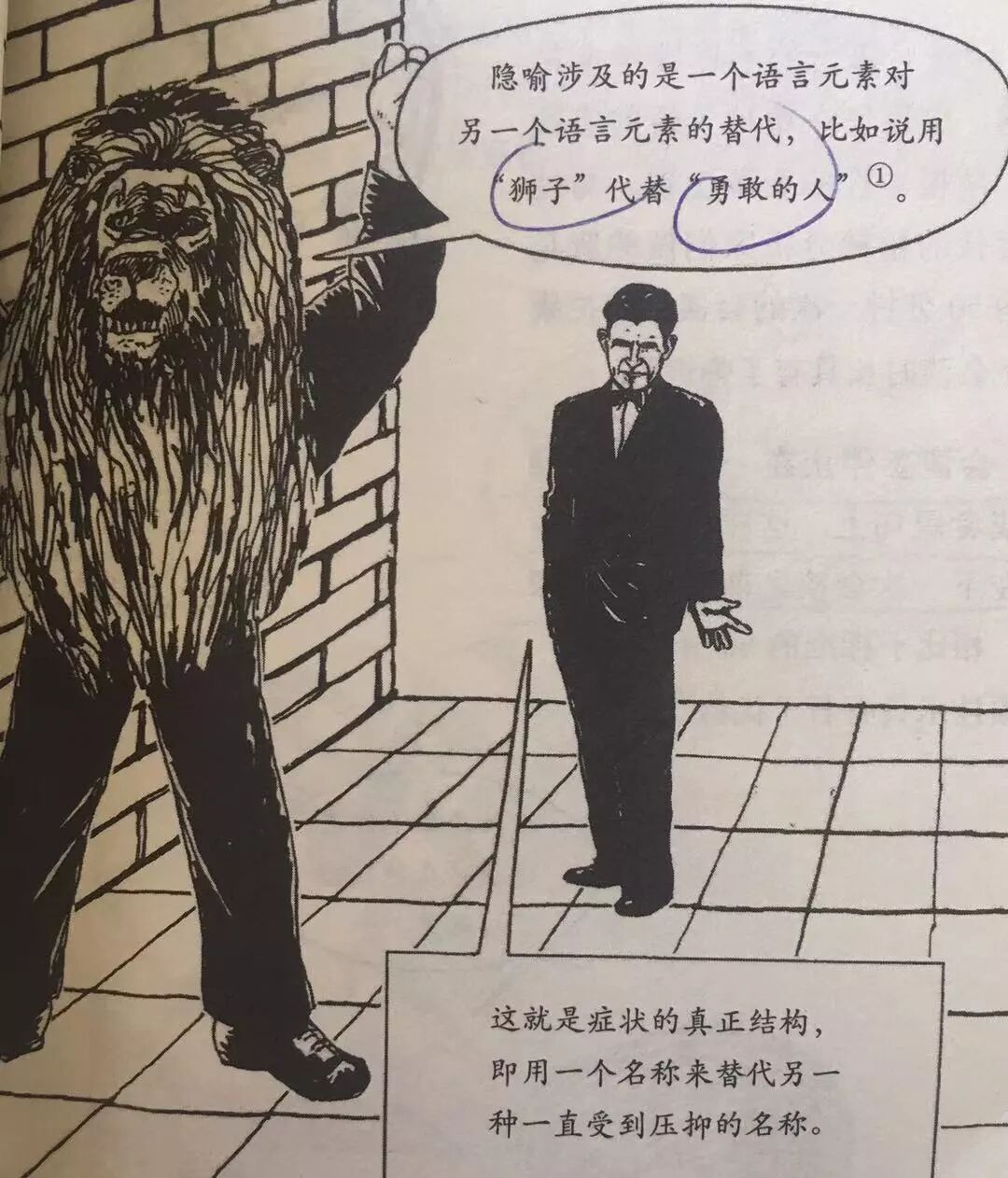 俄国语言学家罗曼·雅各布森基于对两种失语症的研究,区分了语言的两个基本相对的轴,历时性的隐喻轴,处理的是语言项目的选择与替代,而共时性的换喻轴处理的则是语言项目的组合与联系。拉康吸收了雅各布森的语言学研究,将隐喻与换喻引入了精神分析的领域。拉康将隐喻与换喻的区分联系于弗洛伊德所描述的梦的工作机制:对于雅各布森,换喻联系着凝缩与移置,而隐喻则联系着认同与象征化,但拉康则将隐喻联系于凝缩,将换喻联系于移置。在拉康看来,隐喻是一个能指对另一个能指的替代、其意指功能是对能指与能指之间的杠的穿越,而换喻则是一个能指与另一个能指的关系,其意指功能是对能指与能指之间的杠的维持。拉康认为,神经症的压抑具有一个隐喻的结构:换喻的对象(即被替代的能指)受到压抑,但是却返回在由隐喻所产生的剩余意义之中。因此,症状(即压抑物的返回)也具有一个隐喻的结构,继而,拉康进一步声称“症状是一个隐喻”。