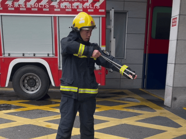 消防员又将气球放在地上,在距离一米处用弹弓对着气球进行射击。