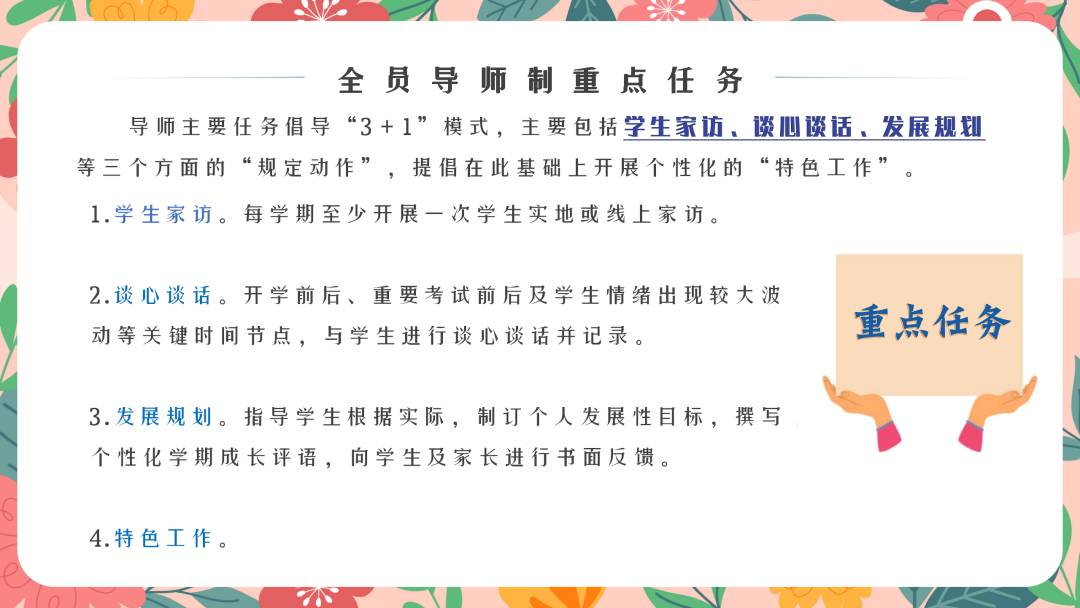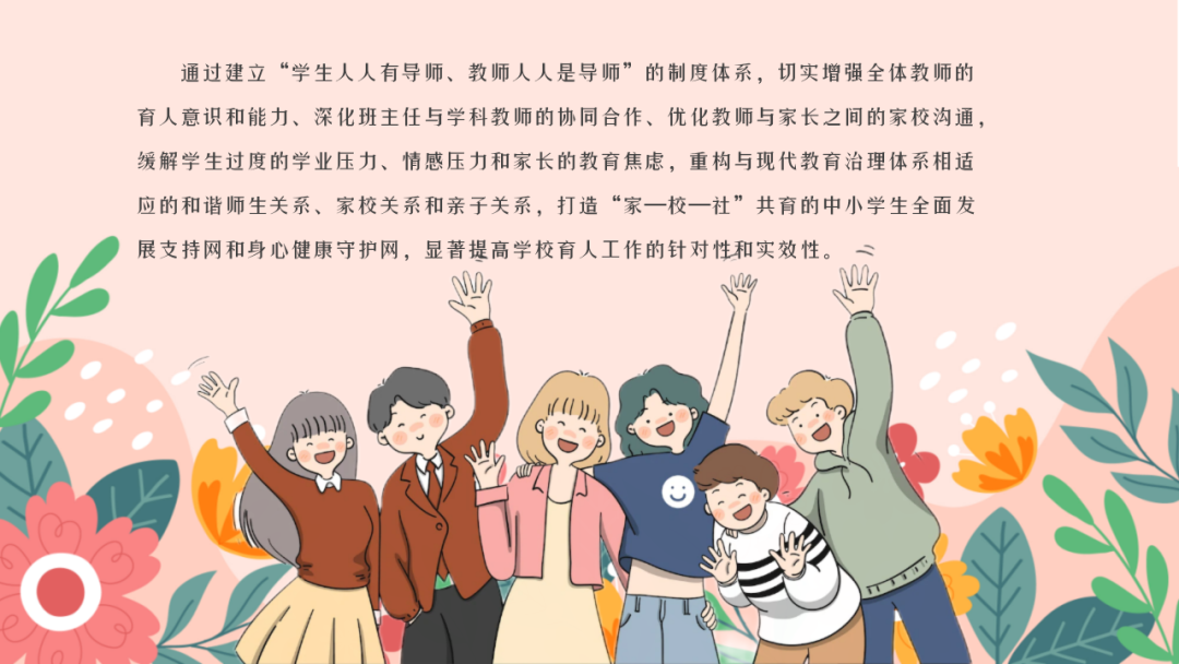 下阶段,学校将按照导师制匹配原则进行师生匹配,在六个导师团的引领下,导师将对学生进行全面的发展指导和开展有效的家校沟通,既做学生的“良师益友”,关心指导他们全面发展,疏解学业压力、增强成长信心,积极构建“家校沟通”的桥梁,缓解家长养育焦虑,引导家长树立正确教育观。