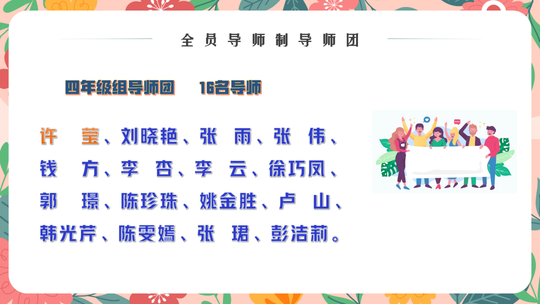 潘副书记向全体教师选读了导师制领导小组名单并介绍了我校导师制的“3+1”模式:学生家访、谈心谈话、发展规划;以及在此基础上的“特色工作”。他希望老师们能积极思考,沉浸式与孩子们成为朋友,真正地将这项工作落到实处,让这个特色工作焕发它真正的生机。