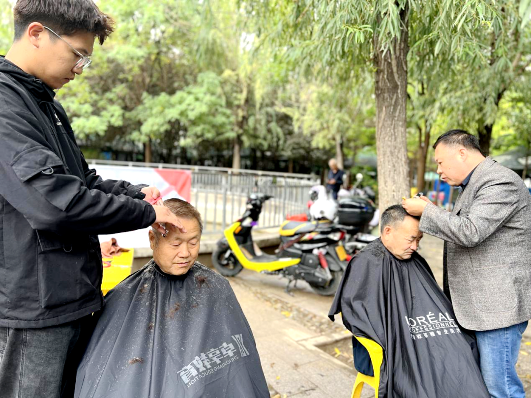 另一边,前来理发的居民络绎不绝。“叔叔,想怎么剪啊?”“阿姨,天冷了,咱们不要剪得太短了,不然头会冷的。”理发师们一边精心地为老人修剪头发,一边亲切地和老人拉家常,时不时问询老人的修改意见。在家长里短中听听老人的心声,让理发和等待过程变得不再枯燥。大家互相欣赏刚修剪好的发型,露出了满意的笑容。