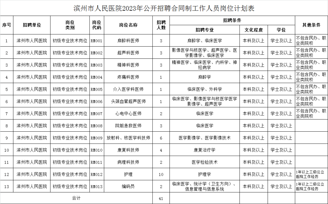 滨州市人民医院计划招聘合同制工作人员41名,招聘岗位及具体要求详见《滨州市人民医院2023年公开招聘合同制工作人员岗位计划表》(附件1)。