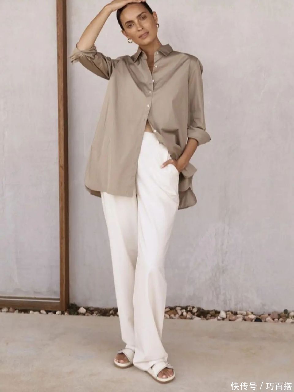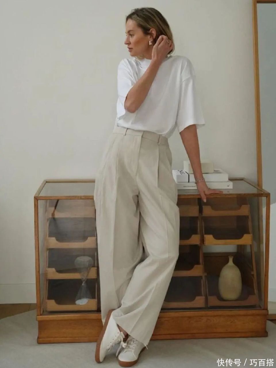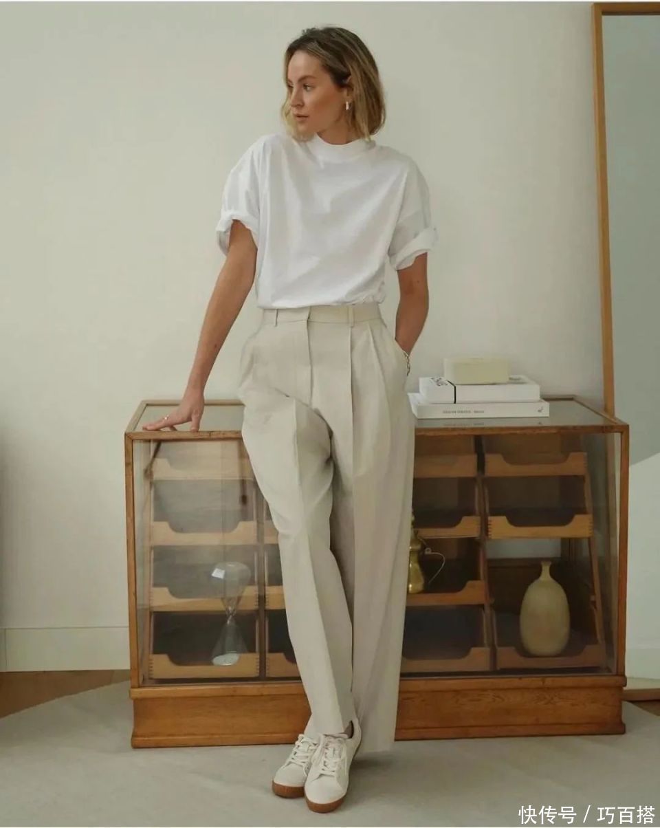 这种情况下,纯白T恤和奶茶色高腰拖地西装裤是正儿八经符合要求的单品,两者搭配干净清爽,配色清雅、款式基础、穿衣方式简单大气、单品材质挺括透气,从视觉呈现和氛围感展示上,都格外迷人,包容性强百搭好驾驭,人人都能学习借鉴!