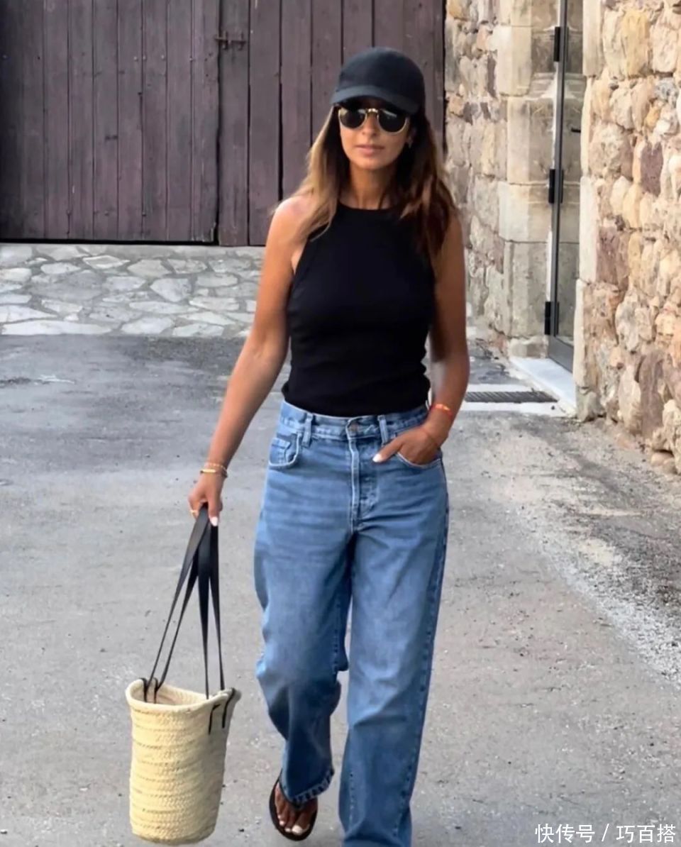 纯黑吊带背心与深蓝色牛仔裤的结合,飒爽干练,又娘又man的视觉效果别提有多绝了,对身材比例不协调和身形轮廓不完美的姐妹来说,都非常友好!