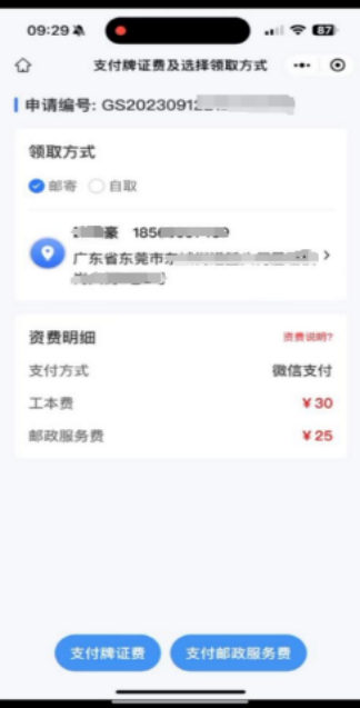 车主填写收件信息后,核对无误后分别支付牌证工本费和邮政寄递服务费。