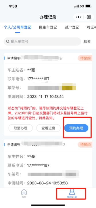 1.点击“我的订单”选择登记上牌点和具体时间(可预约当日)交验车辆,然后携带相关资料按照预约的具体时间到约定的登记上牌点交验车辆;