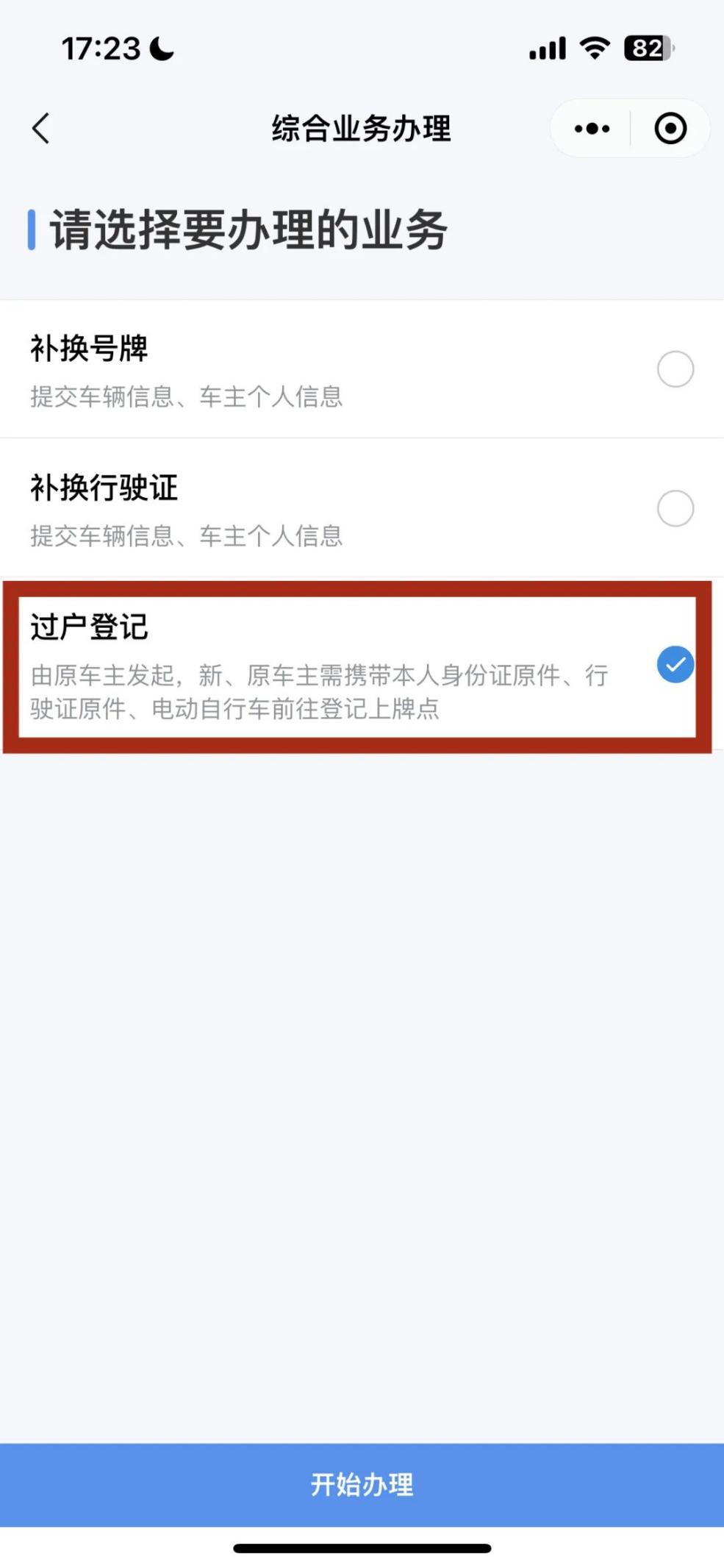 1.打开“东莞电动自行车”小程序后,点击“电动自行车综合业务办理登记-过户登记”;