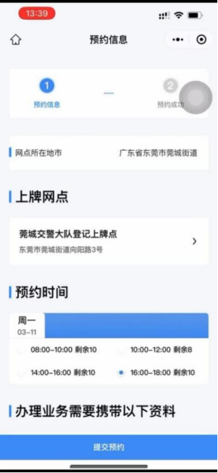 1.提交成功后,点击“立即预约”按钮,选择登记上牌点和具体时间(可预约当日)核验车辆,携带身份证明(委托办理还需提交受托人身份证明及授权委托书)、行驶证及车辆号牌(如遗失需签署遗失声明),按照预约的具体时间到约定的登记上牌点核验车辆;
