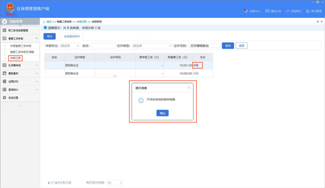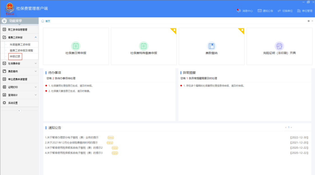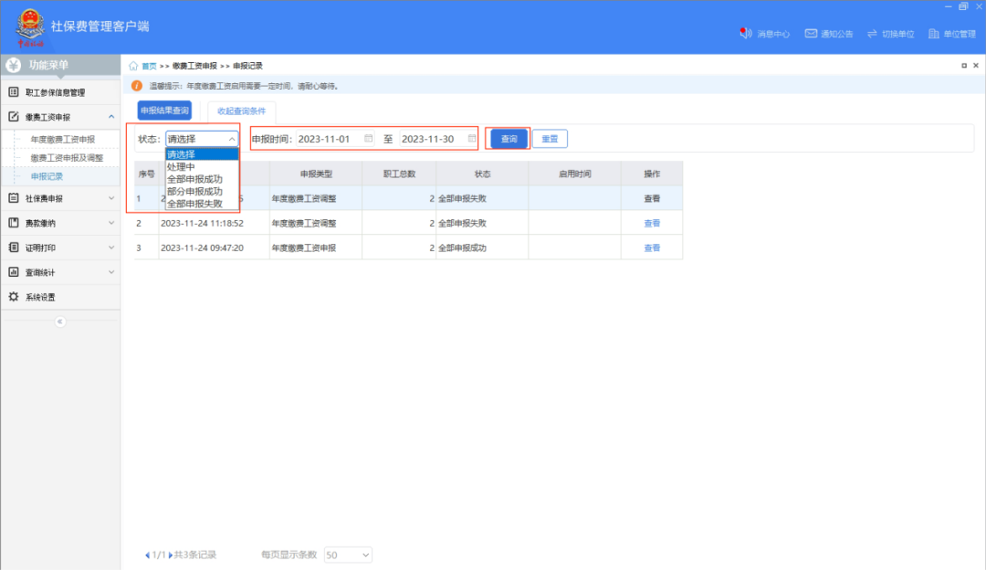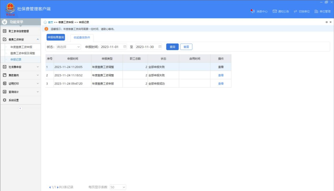 用人单位登录社保费管理客户端(用人单位),在【缴费工资申报】-【申报记录】模块查看已申报的年度缴费工资。