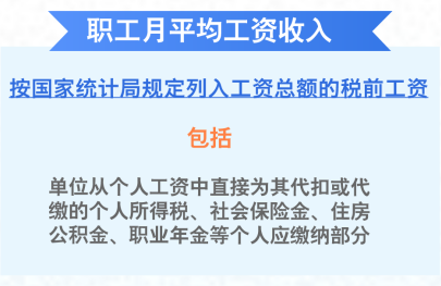 答:职工月平均工资收入是按国家统计局规定列入工资总额的税前工资,包括单位从个人工资中直接为其代扣或代缴的个人所得税、社会保险金、住房公积金、职业年金等个人应缴纳部分。