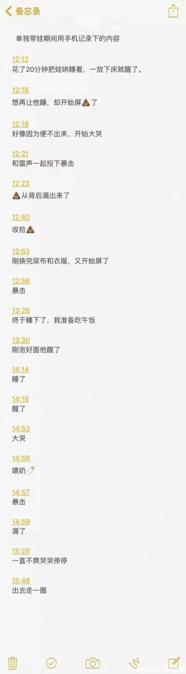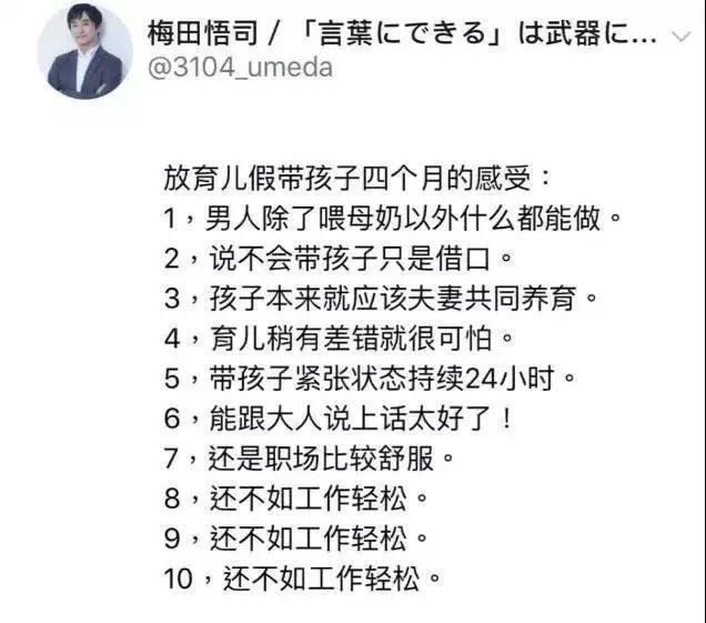 日本有一位爸爸觉得自己老婆说了一句带娃很辛苦就认为是矫情,后来就想自己来尝试带一天,看看是自己平时低声下气给别人打工赚钱辛苦,还是在家带娃更辛苦一些。为了让老婆心服口服,就做了详细的记录。然而,从开始的哄娃睡觉就失败了,因为娃在睡觉时拉了粑粑,这位爸爸不会换尿不湿,而宝宝直哭要妈妈。在与孩子僵腾了1个小时之后,这位爸爸宣布自己挑战失败!