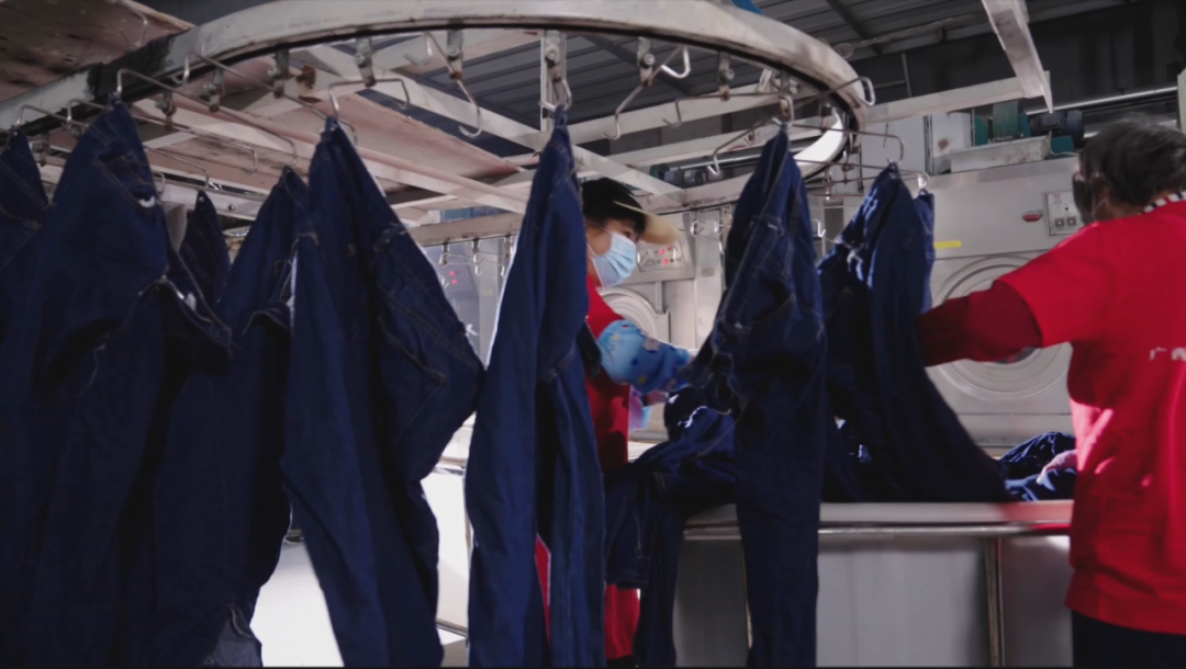水洗车间里机器轰鸣,工人们正有序忙碌着。除浆、气磨、过水、烘干……在高温蒸汽作业后,一件件作旧变柔的牛仔裤,刚下生产线,便被打包装运上车。