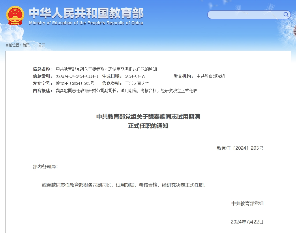 魏秦歌同志任教育部财务司副司长,试用期满,考核合格,经研究决定正式任职。