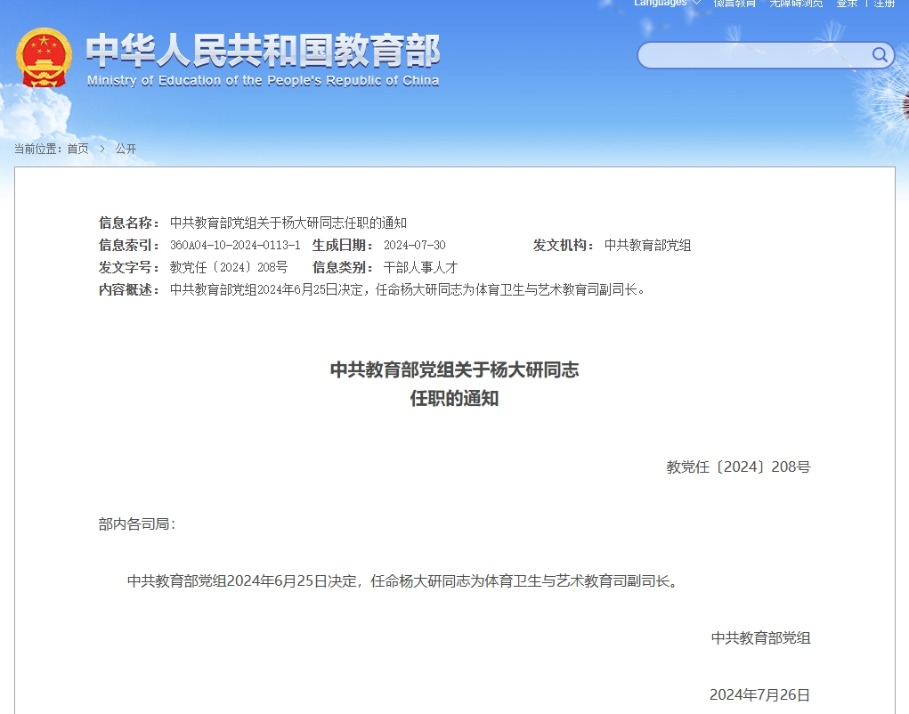 中共教育部党组2024年6月25日决定,任命杨大研同志为体育卫生与艺术教育司副司长。