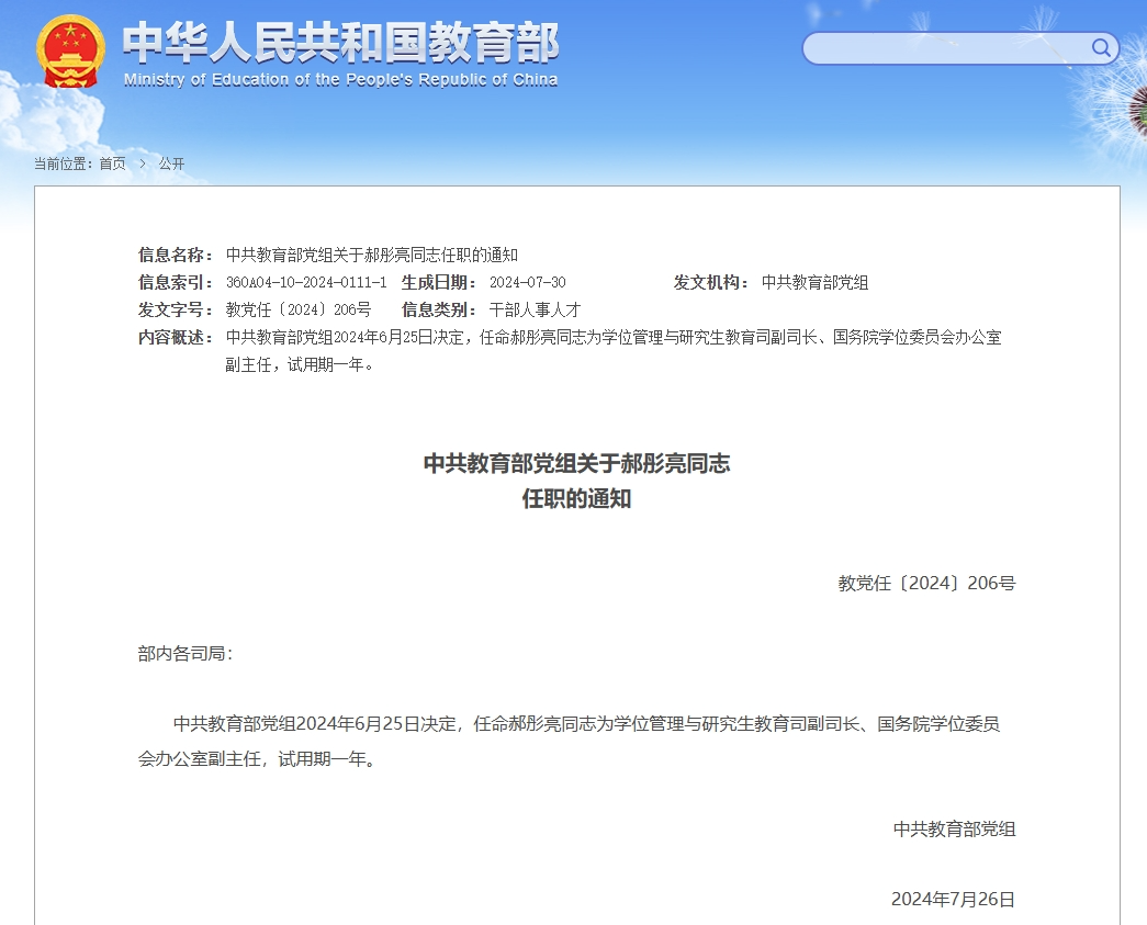 中共教育部党组2024年6月25日决定,任命郝彤亮同志为学位管理与研究生教育司副司长、国务院学位委员会办公室副主任,试用期一年。