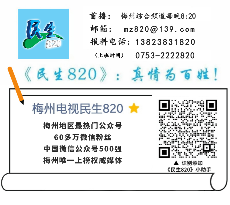 今晚《民生820》将联合晓记家电送出820元代金券、空调清洗券、油烟机清洗券、手持小风扇、旅行茶具、保温壶以及内蒙古犇圣牧业提供的臻品装纯牛奶等丰富礼品。欢迎关注今晚《民生820》节目,第一时间发送短信报名免费领粉丝互动福利。需要注意的是,活动期间,为了回馈更多的忠实粉丝,一个手机号码只能获取1次粉丝福利。还没有关注我们公众号的粉丝,可以点击下方“梅州电视民生820”公众号名片,或在微信中搜索“梅州电视民生820”,关注并设为星标,第一时间收到信息。责编:巫婉超、叶蔚