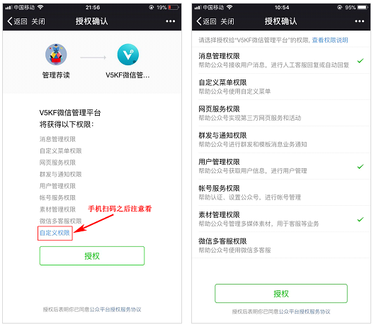 2、用公众号管理员的手机微信扫一扫二维码并在手机【自定义权限】,必须给V5以下3个权限: